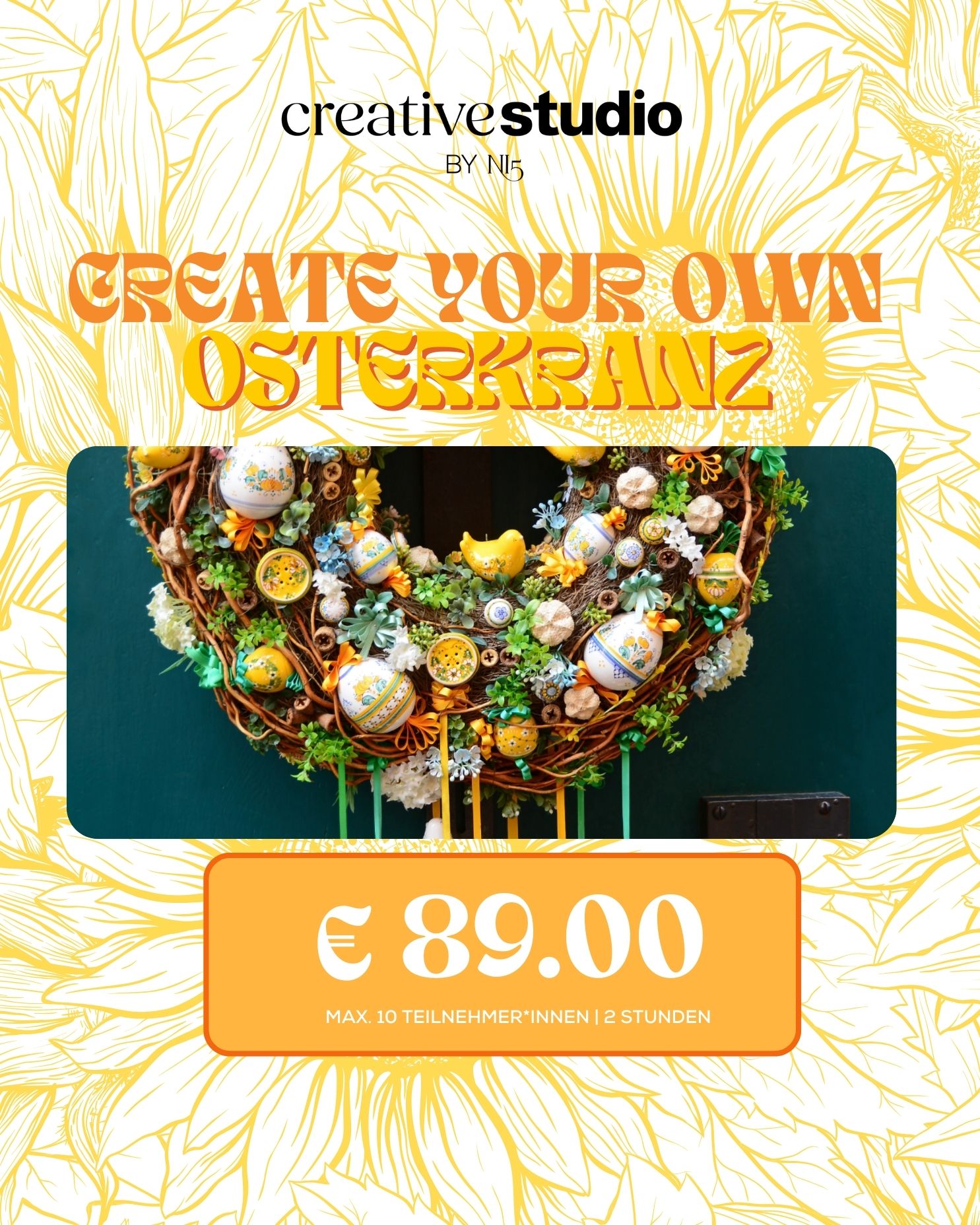 Naturmaterialien, Trockenblumen, Zweige, Bänder, Osterelemente und dekorative Highlights stehen dir zur Verfügung.